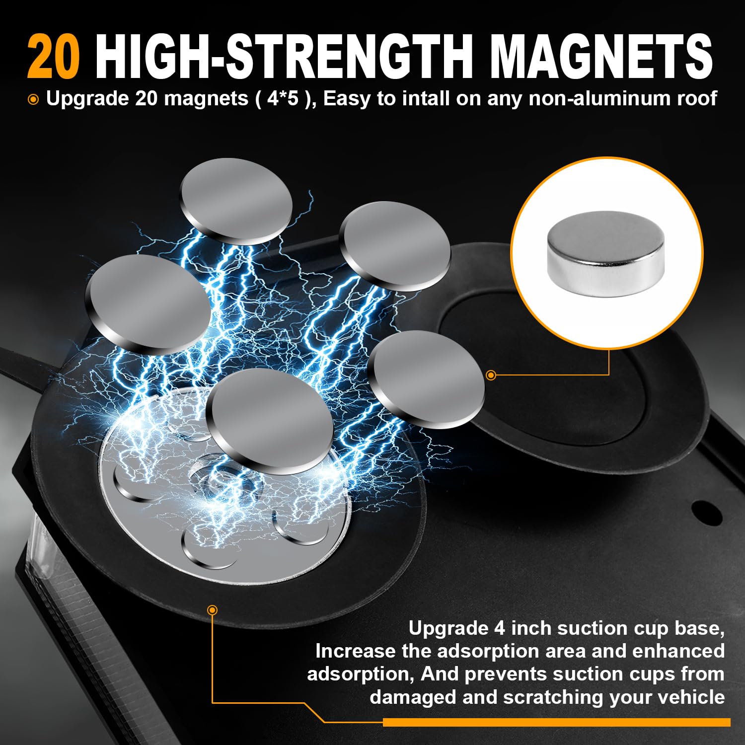 - ā 20 HEAVY-DUTY MAGNETS--The lightbar easily attaches to any metal rooftop using the 20(4*5) strong magnetic feet with rubber padding, without hurting the roof of your vehicles (Test go up to 80mph but not fall off). 9.8ft cigarette lighter adapter cable and 9.1 controller cable, long enough to install the light anywhere in the vehicles.