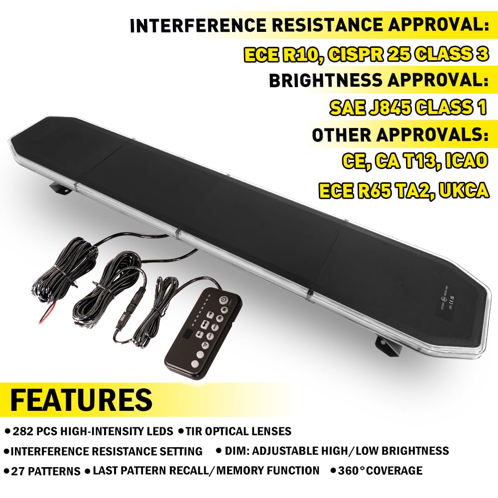 - INTERFERENCE RESISTANCE -- We have upgraded the function of this emergency light bar to make it anti-interference. It is ECE R10 and CISPR 25 CLASS 3 approved and will not cause any interference to your other electronic devices, while other electronic devices will not interfere with the light bar, increasing the life of the light bar.