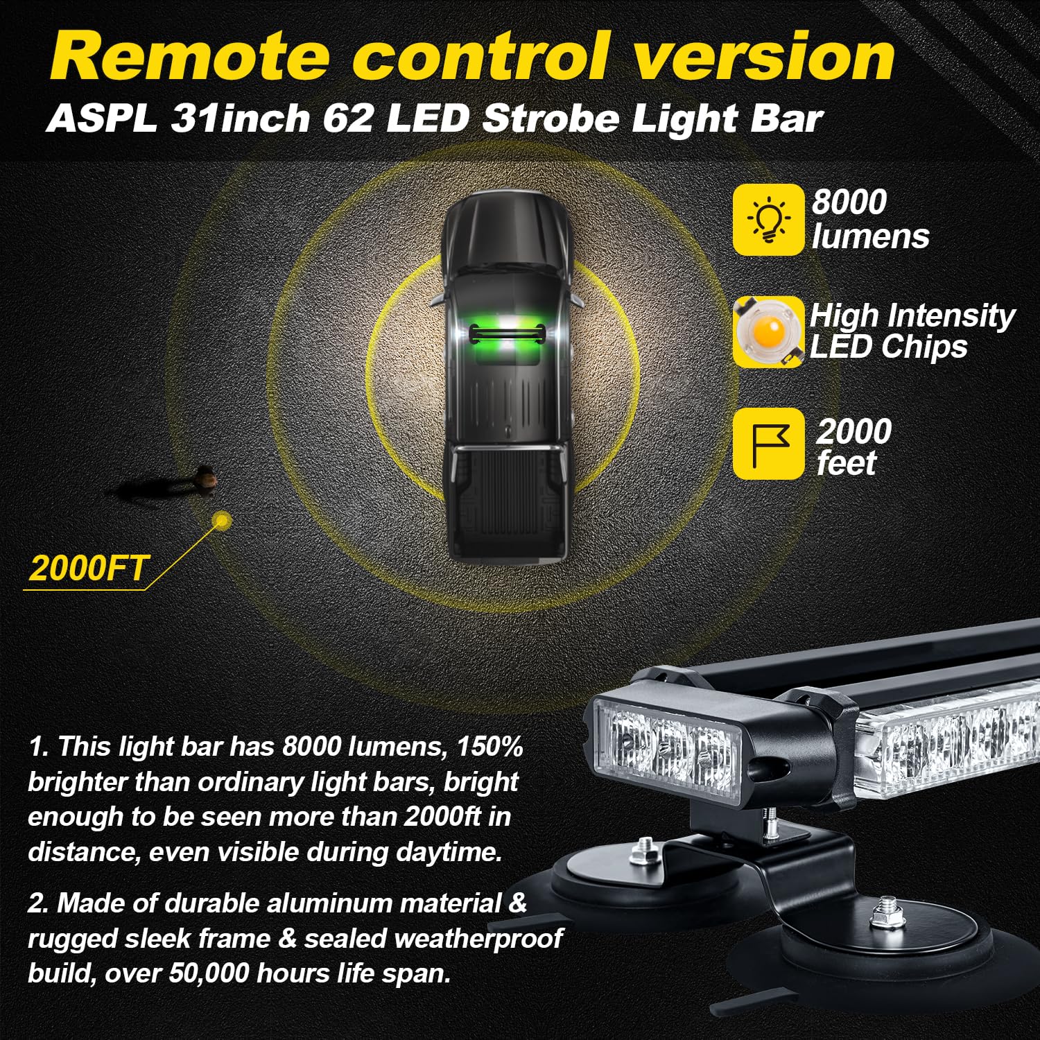 - ãSUPER VISIBILITYãThis ASPL 31âemergency strobe light bar uses 62 high-intensity LED beads and crystal-cut clear TIR optic lenses, Bright enough for day use. And the intensity of light will not decay after a long period of use. Effectively warn other vehicles to keep you safe.